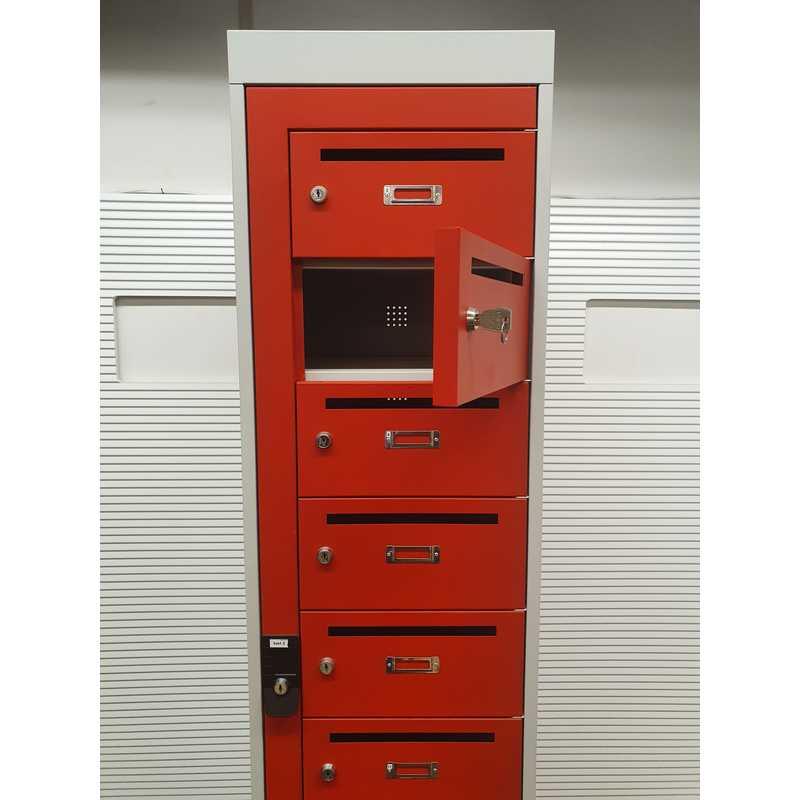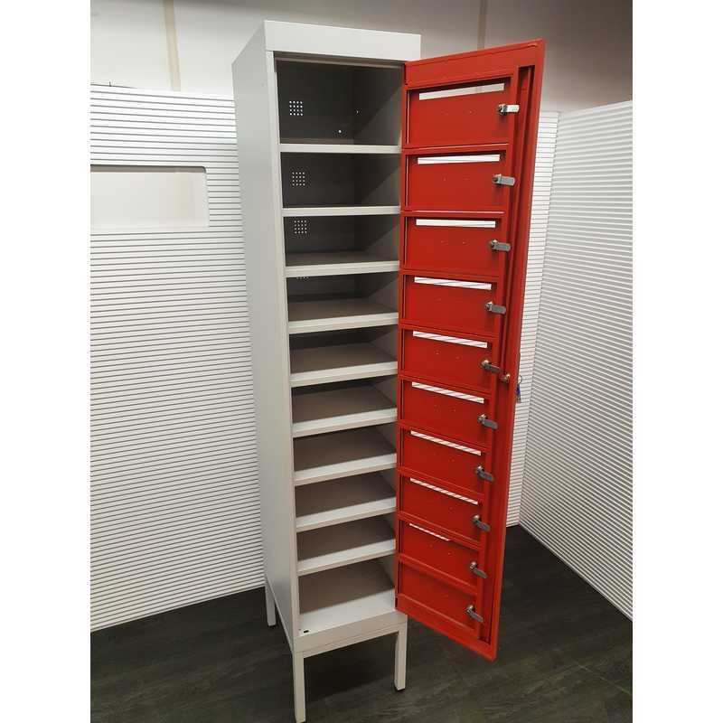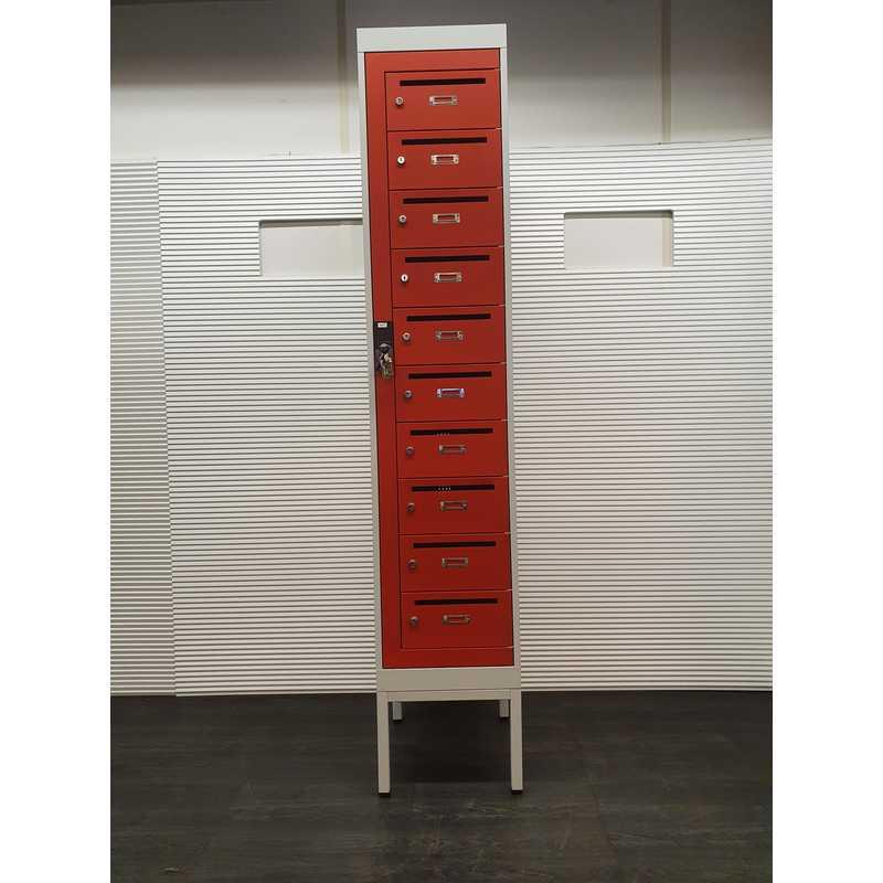 Lockerkast, 10 brievenbuslockers H210xB40xD50cm, metaal, lichtgrijs met rode deurtjes, ontluchtingsroosters achterkant. H16 xB38xD40