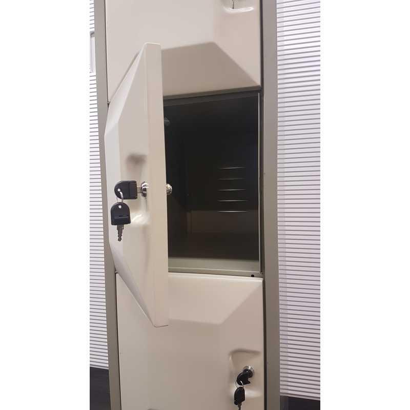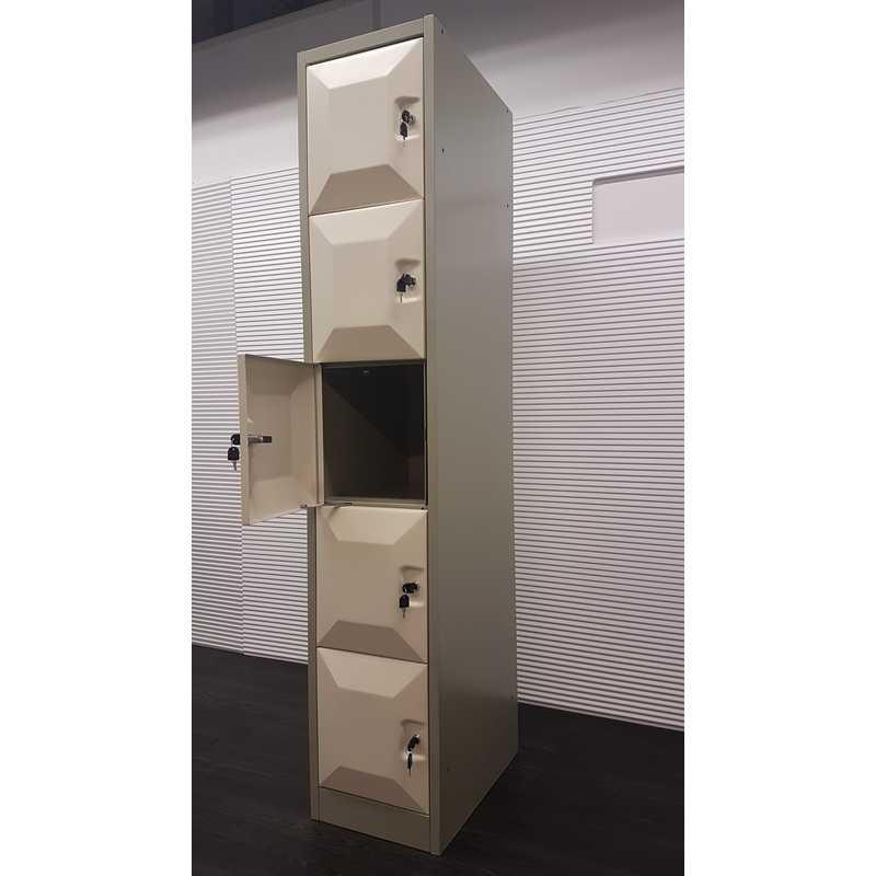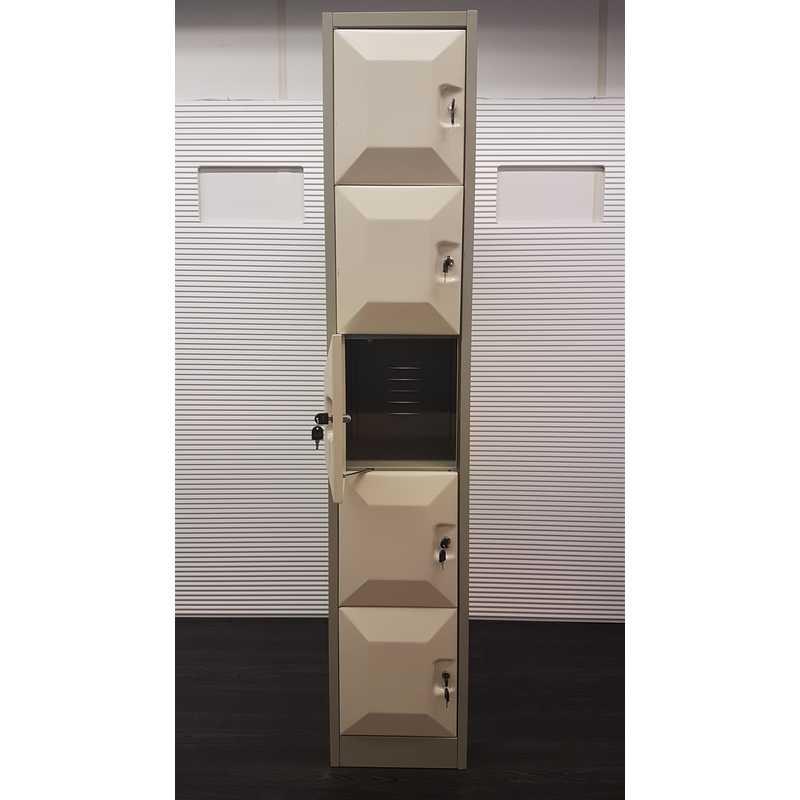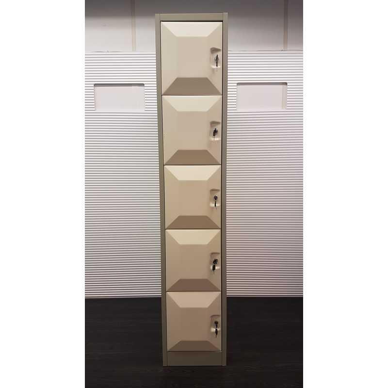 Lockerkast, 5 lockers, H194xB37xD56cm, metaal, créme, ontluchtingsroosters achterkant. Locker maat: H36xB32xD56