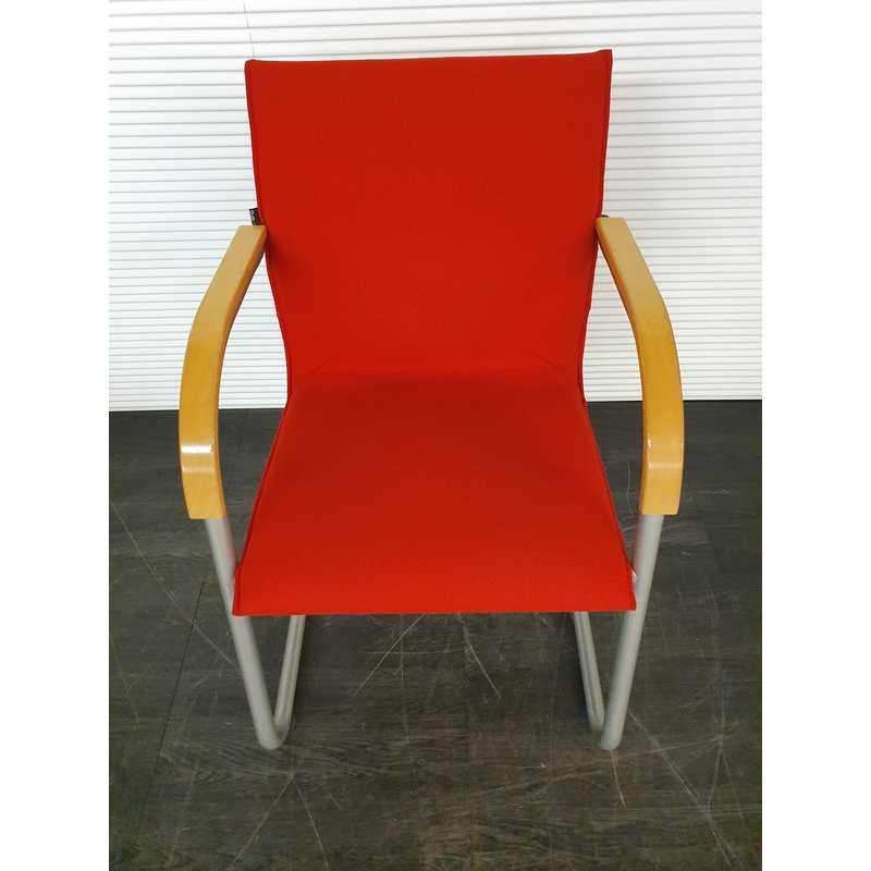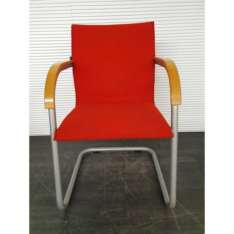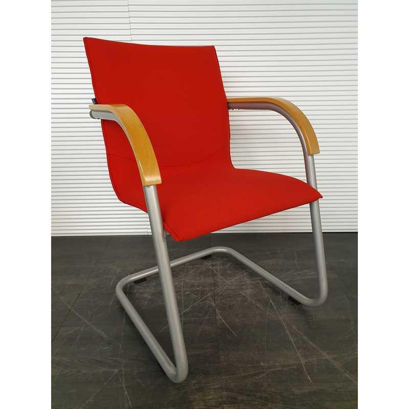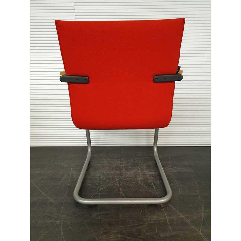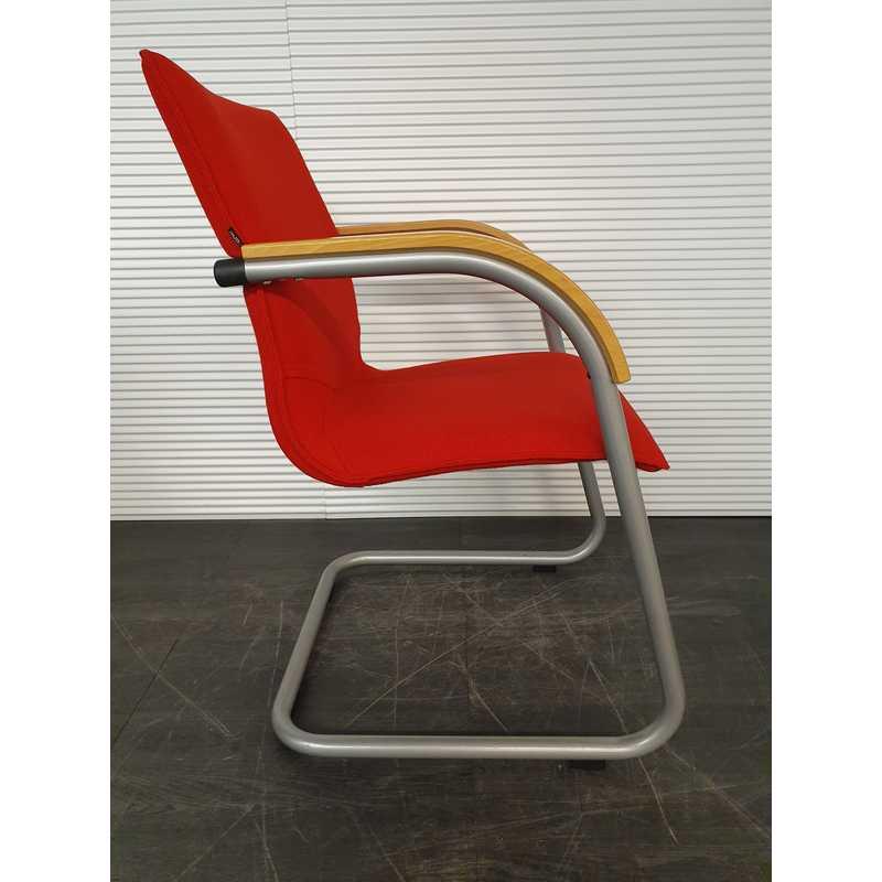 Ahrend vergaderstoel, rode stof, hout afwerking armleuning, zilvergrijs slede