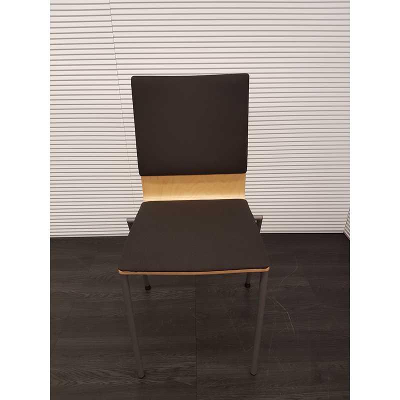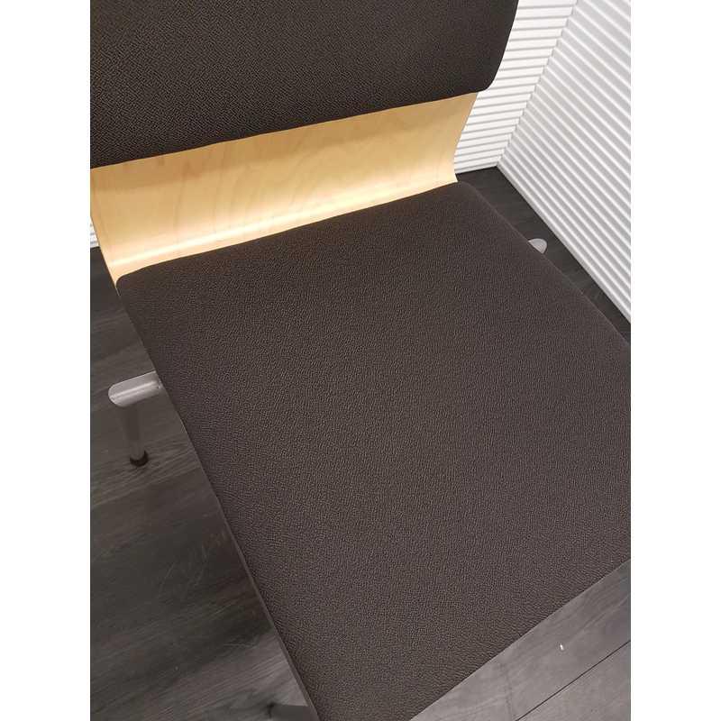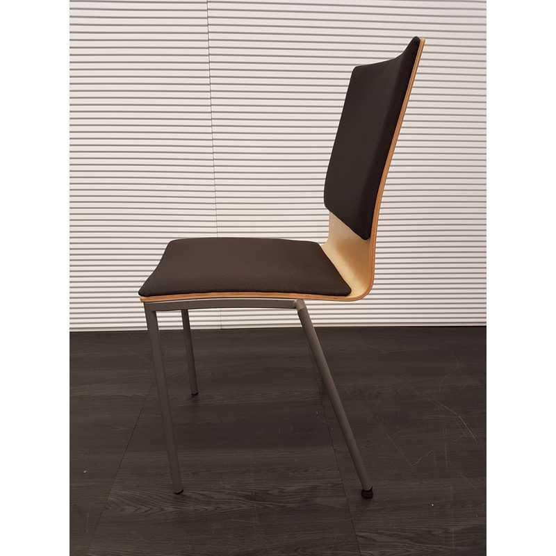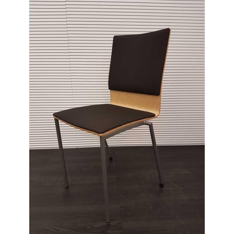 Kantinestoel, hout met nieuwe bruin gestoffeerde zitting en rug, poten mat antraciet