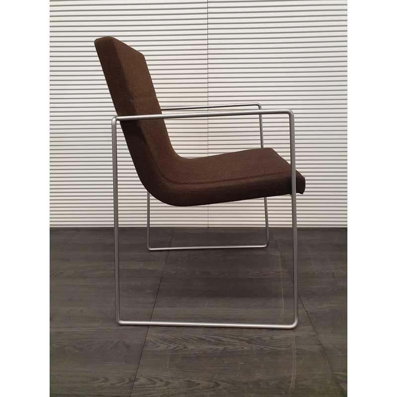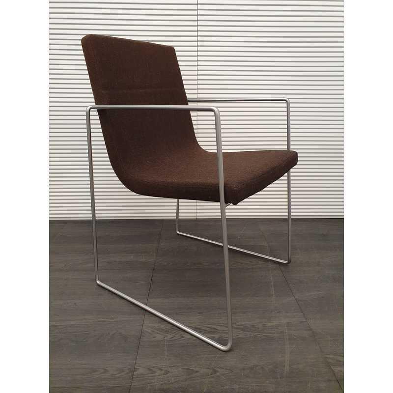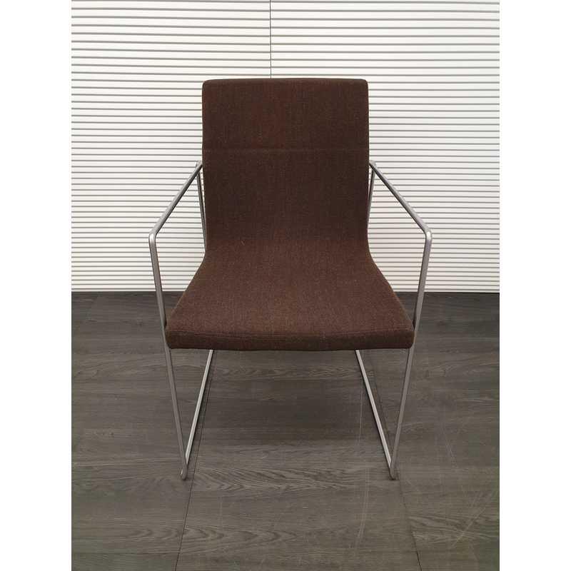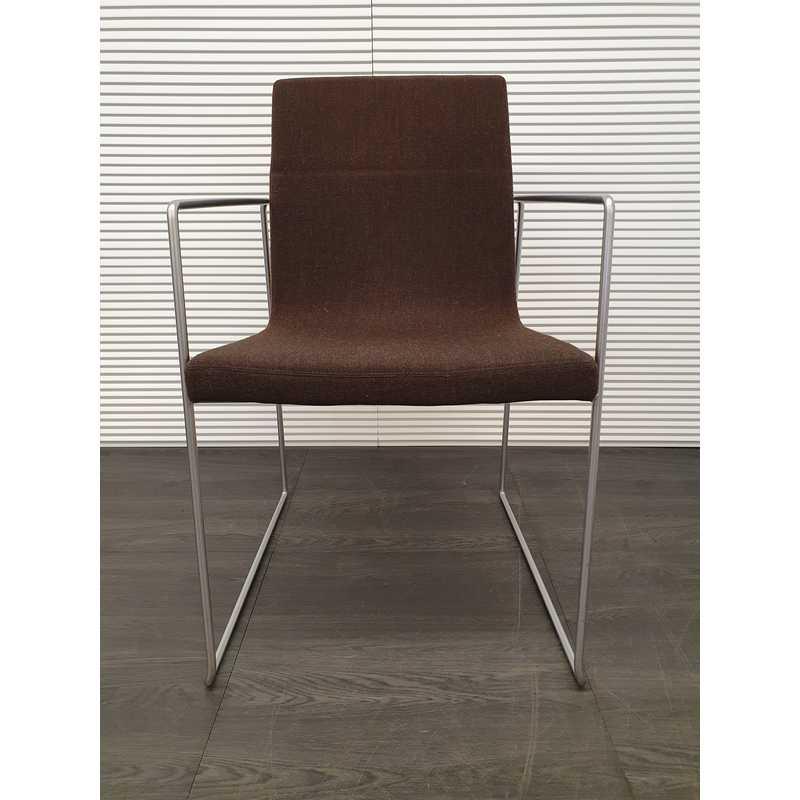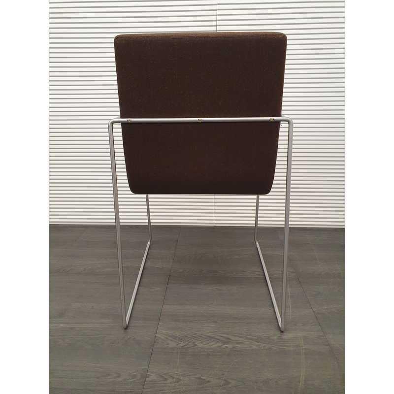 Vergaderstoel, bruin gestoffeerd met mat rvs draadframe en armleuningen