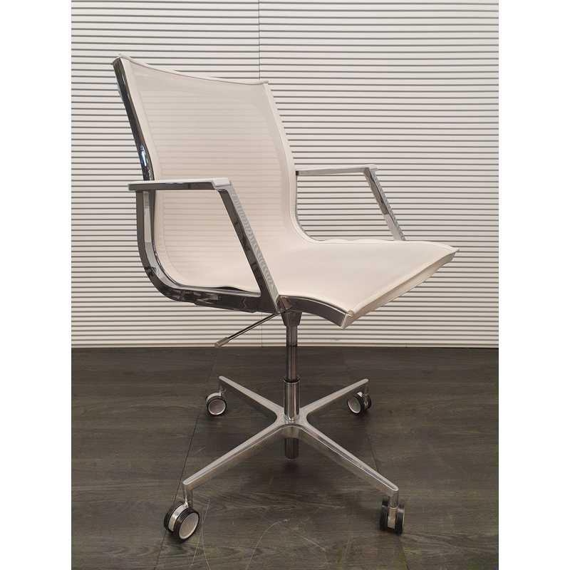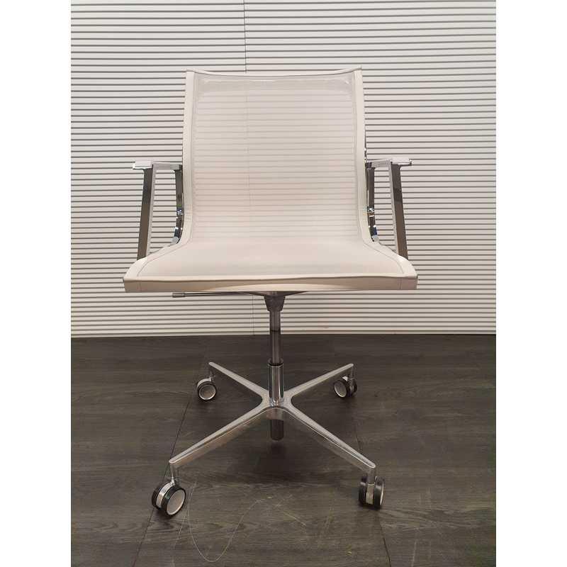 Luxy Nulite vergaderstoel,wit netwave zitting en rug met lederen afwerking, gepolijst aluminium voetenkruis met wielen