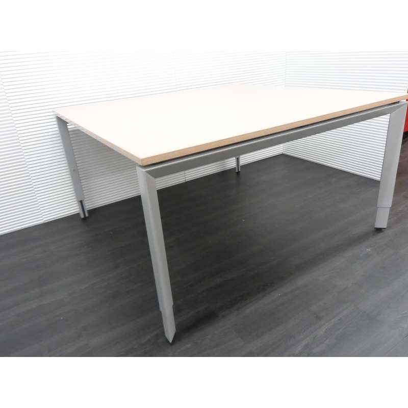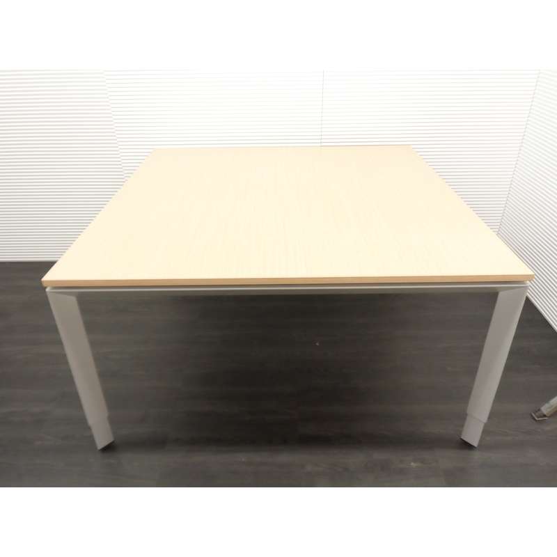 Steelcase vergadertafel, 140x140cm, mat wit 4poot hoogte verstelbaar met licht eiken zwevend blad