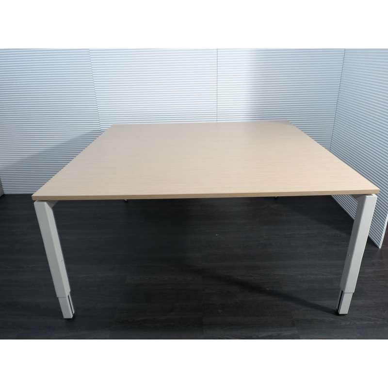 Steelcase vergadertafel, 160x160cm,mat wit 4poot hoogte verstelbaar met licht eiken zwevend blad